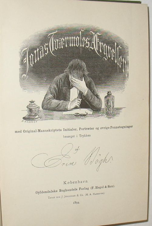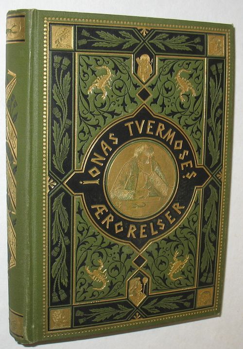 Jonas Tværmoses Ærgrelser Gyldendal, København 1894. 473 sider. Flot hellærredsbind rigt guldforgyldt Meget pæn uden brune alderspletter. Med Original-Manuskriptets Initialer, Portræter og øvrige Pennetegninger besørget i Trykken.