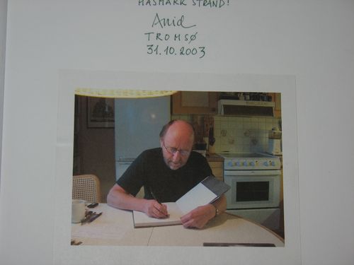 Indsat billede af Arvid Sveen som signerer/dedikerer bogen til en i bogen navngiven person